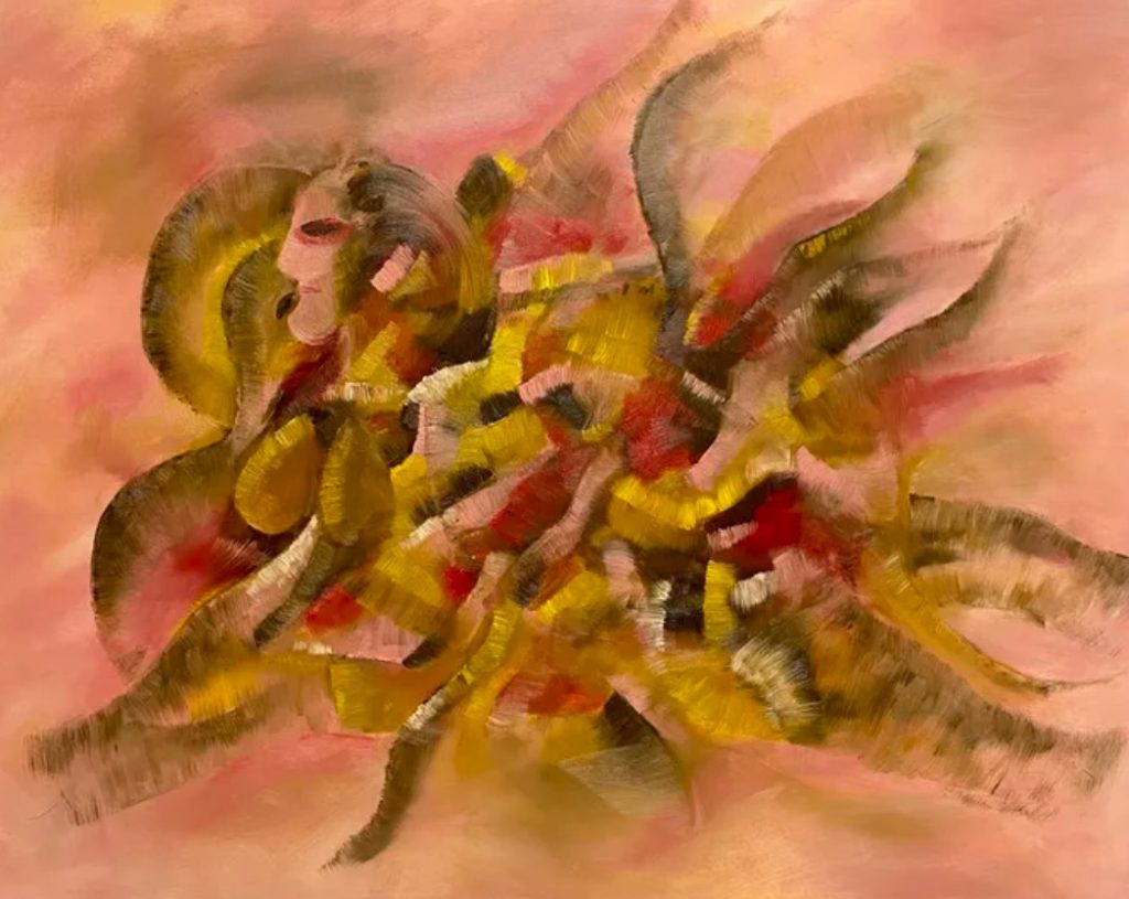 "Celebration" captures the spirit of joy and festivity through a vibrant play of red, blue, and yellow hues. With lively figures, rhythmic movement, and bursts of color, the painting embodies harmony, happiness, and the energy of celebration.
